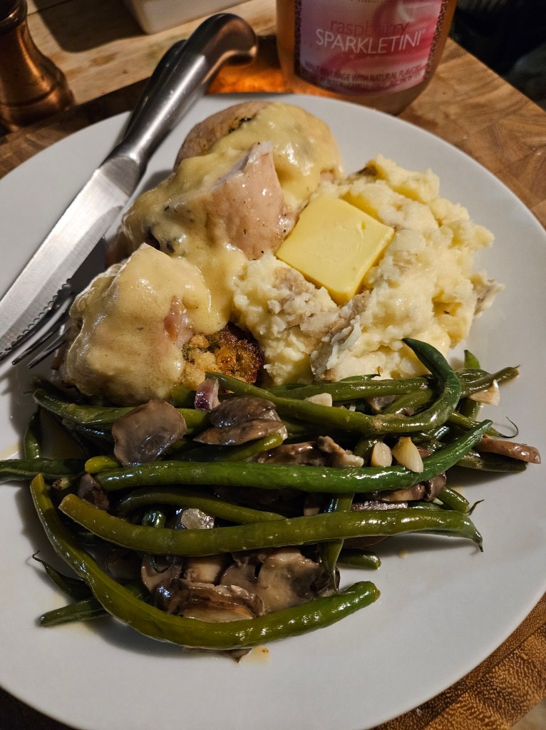 So I did it. I made a great (if a little too salty) meal. It was a modification of my standard Thanksgiving: Turkey roulette (filled with the stuffing), gravy, mashed potatoes, and green bean casserole.